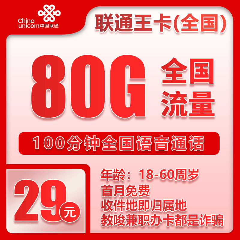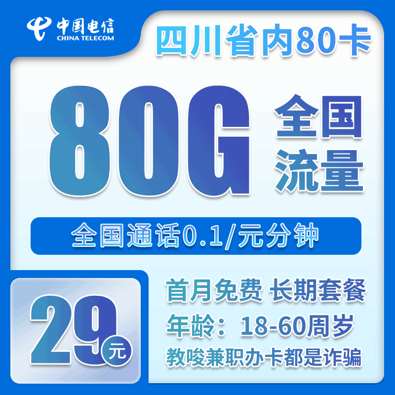 29元80G全国流量+0.1元/分钟国内通话(专属充值50享优惠)